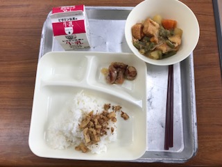 献立:鶏肉のてり焼き、じゃがいもとあつあげの煮もの、ごまかかいため、ごはん、牛乳