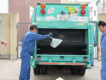 はじめは、実際にパッカー車を見て、動かしていただいて説明を聞きました。