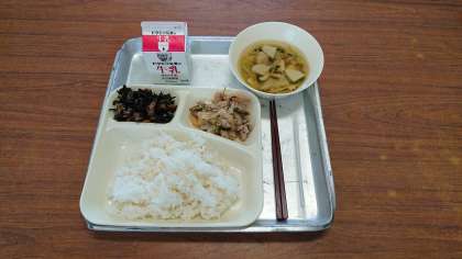 献立:豚肉のごまだれ焼き、ひじきのいため煮、五目汁、ごはん、牛乳