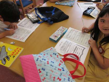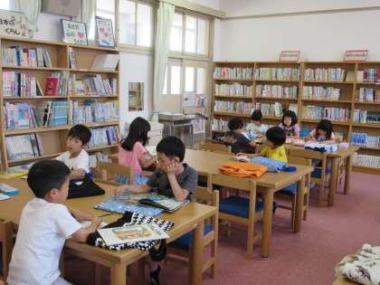 1年生は図書館の本の貸し出しを行っています。本を決めたら図書室で読書をしています。本を読み終わった人は「読書貯金カード」に記録をしています。