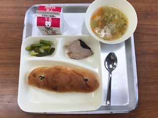 献立:かつおのガーリック焼き、鶏肉とじゃがいものスープ、グリーンアスパラガスのサラダ、パン、牛乳