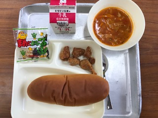 献立:一口トンカツ、ミネストローネ、豆こんぶ、パン、牛乳