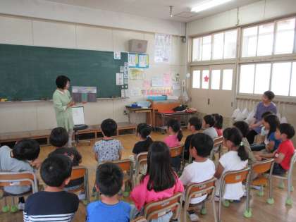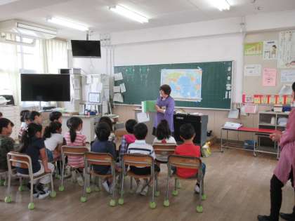 今日は、東成図書館からパンジーお話会の方に来ていただいて全学年お話会をおこないました。楽しい絵本の読み聞かせやお話を聞かせていただきました。