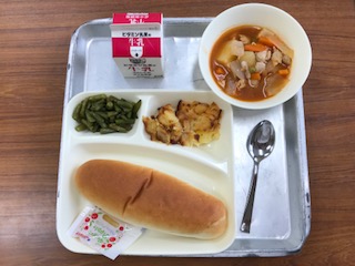 献立:ケチャップ煮、さんどまめのソテー、りんごのクラフティ、りんごジャム、パン、牛乳