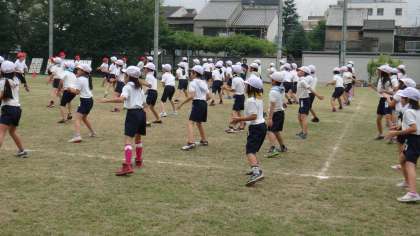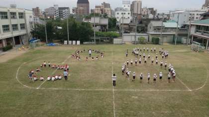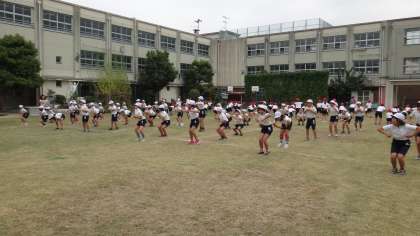 3・4年生が運動場で団体演技の練習をしました。講堂とは違う広い運動場での演技。自分の位置等を確認しながらの練習でした。