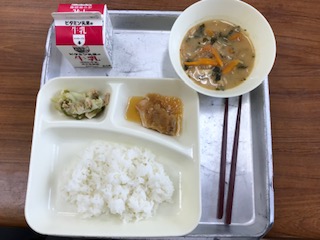 献立:鶏肉のおろしじょうゆかけ、みそ汁、野菜いため、ごはん、牛乳