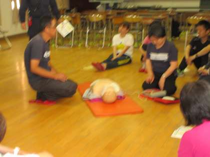 本日、14時30分より本校多目的室で救命法の講習会が行われました。消防署から救急隊の方に来ていただいて、講話・人口呼吸法・心臓マッサージ・AEDの実技が行われました。保護者の方々も参加していただきました。