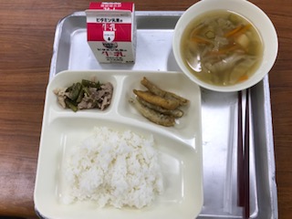 献立:いわしてんぷら、すまし汁、豚肉とさんどまめのいためもの、ごはん、牛乳