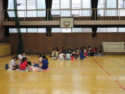 予定では北浜付近でお弁当を食べることになっていましたが、雨のため学校に帰ってきて講堂で3年生全員でお弁当を食べました。