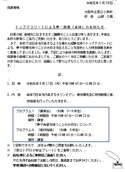 3・4・5・6年生 夢・授業「卓球」のお知らせ
