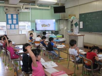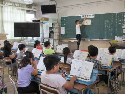 1年生は算数の「ぜんぶでいくつ」の学習をしています。2年生・3年生は音楽の学習をしています。2年生は鍵盤ハーモニカ、3年生はリコーダーの練習をしています。