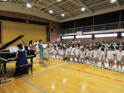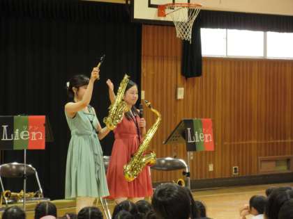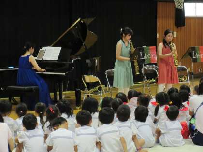 深江幼稚園の年長組の子どもたちも参加していただいて、サクソフォンの種類や音など教えていただいたり、曲に合わせて体を動かしたりととても楽しいひと時を送りました。最後はみんなで「さんぽ」を合唱しました。