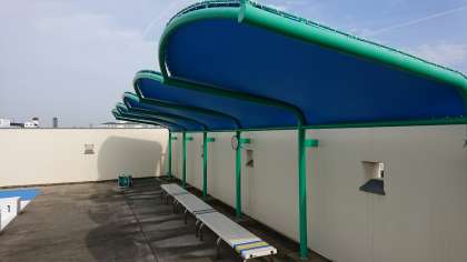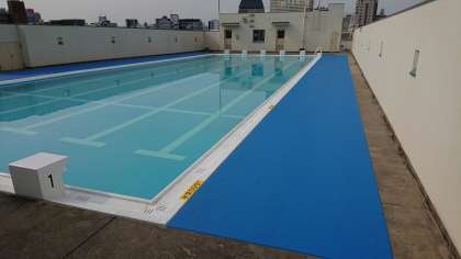 また、暑さ対策とすべり軽減のため、今年はプールサイドにマットを設置しました。プールサイドのテントも新しいものに張り替えました。