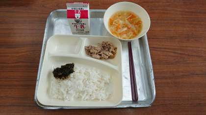献立:豚肉のごまみそ焼き、すまし汁、のりのつくだ煮、ごはん、牛乳