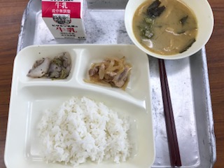献立:鶏肉の甘辛焼き、みそ汁、キャベツの赤じそあえ、ごはん、牛乳