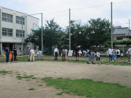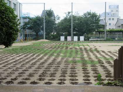あいにくのお天気でしたが、雨が降っていない時間を活用して、PTA、地域の皆様、施設開放の皆様に集まっていただき、芝生の補植の準備のための穴あけをしていただきました。