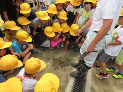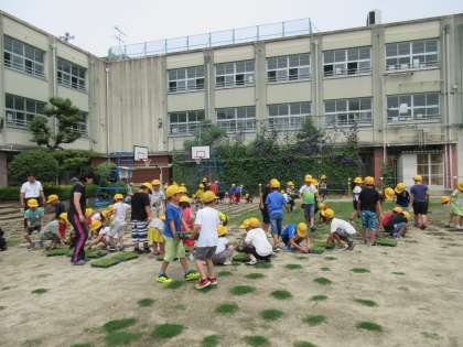 昨日、PTA,地域の皆様に準備をしていただいた運動場で芝生の苗植えをしました。昼休みと放課後にたくさんの児童が参加してくれました。協力してくれたみんなありがとう。