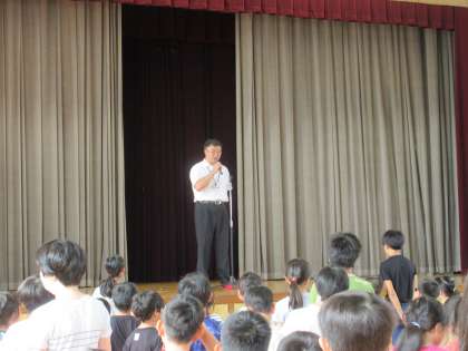 まず、教頭先生と朝の挨拶をしました。水に親しむ季節になったのということで、水難事故に気を付けるようにとお話を聞きました。