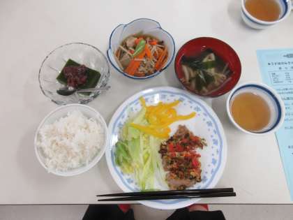 献立:豚肉のパン粉焼き、高野豆腐の五目煮、わかめのスープ、抹茶あずき寒天、ごはん