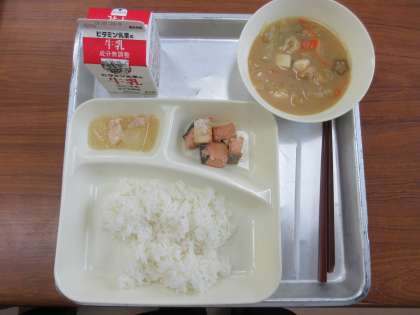 献立:さけのつけ焼き、みそ汁、とうがんの煮もの、ごはん、牛乳