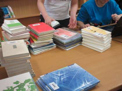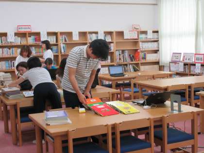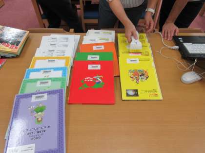 夏休みの期間を使って、教職員で図書室の蔵書点検を行っています。夏休みに貸し出している本も含めて調べます。