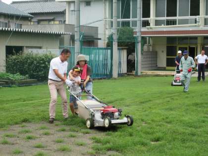補植のための穴あけをしていただいた後で、以前から育っている芝生がかなり伸びてきていたので、芝刈り機で一部分芝刈り体験をしていただきました。