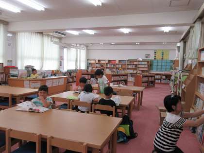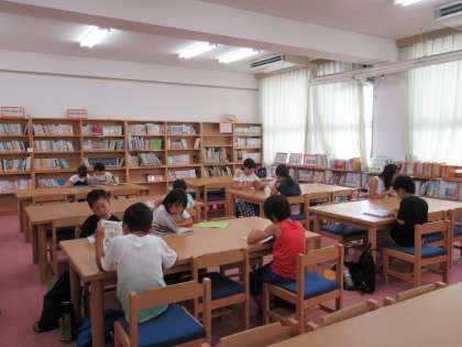 プール開放までの時間や、開放が終わって少し読書をするといった子どもたちが図書館に集まっています。