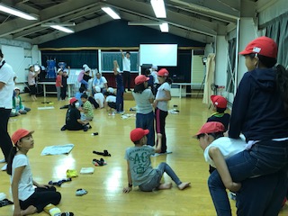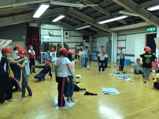 次は陣地ゲームです。じゃんけんに勝たないと新聞紙の陣地が減っていきます。