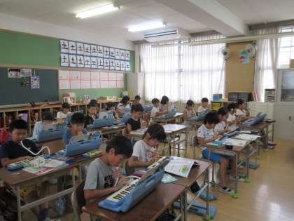 3年生の図画工作と音楽の学習の様子です。折り紙を使った作品つくりや、鍵盤ハーモニカの練習をしています。