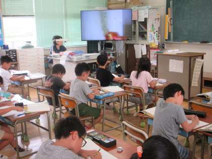1年生は国語の学習で教科書に載っている「木」という詩を先生と一緒に丁寧に試射しています。しっかりとかけています。