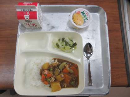 献立:ビーフカレーライス[米粉](ごはん)、野菜のピクルス、みかんゼリー、牛乳