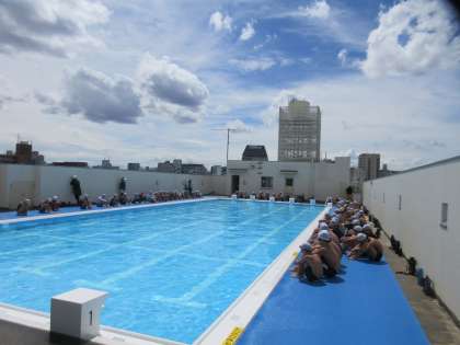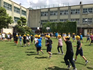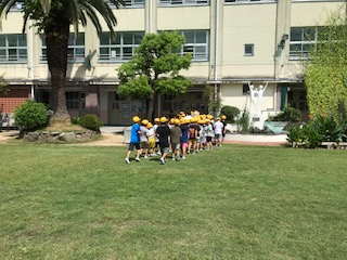緊急地震速報でいったん運動場に避難したあと、津波の危険があるという設定で校舎の3階に避難をしました。高学年は水泳指導中だったので、水から上がり安全を確認しました。