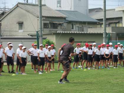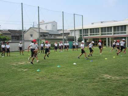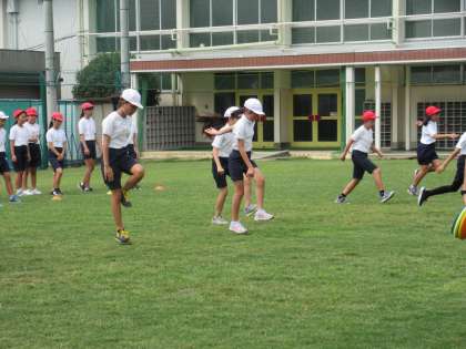 だんだん体がほぐれてきたら、少しずつ走る運動を取り入れます。まずはスキップをしました。できるだけ遠くへ足を出します。