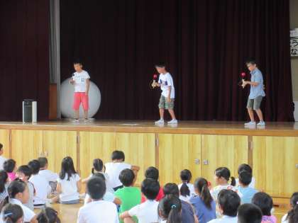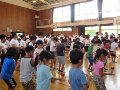 「けん玉集会」は音楽(パプリカ)に合わせて「もしかめ」をしました。けん玉委員会の人たちにお手本を見せてもらい挑戦しました。