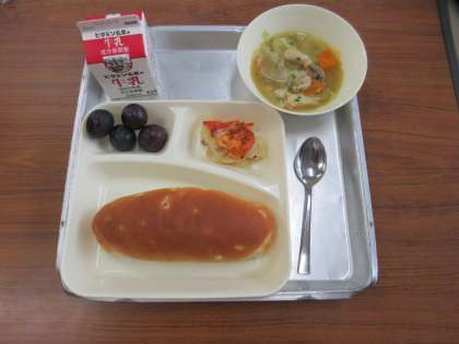 献立:鶏肉とてぼ豆のスープ煮、じゃがいもとトマトのチーズ焼き、ぶどう(巨峰)、パン、牛乳