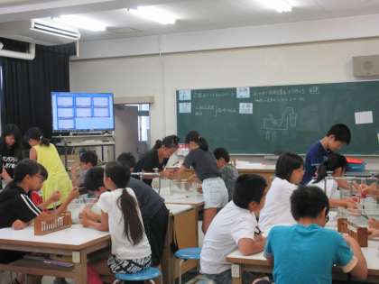 6年生の理科の学習の様子です。今回は炭酸水を使って水溶液の性質を調べています。タブレットや大型テレビを使って実験の結果をまとめています。