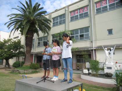 2・3枚目の写真は給食保健委員会からの10月の健康目標の発表です。