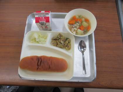 献立:鶏肉のカレー風味焼き、スープ煮、サワーキャベツ、パン、牛乳