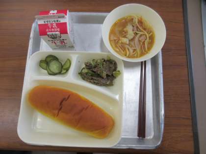 献立:牛肉のカレー風味焼き、トマトスープスパゲッティ、きゅうりのピクルス、パン、牛乳