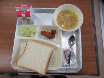 献立:まぐろのオーロラ煮、ベーコンとじゃがいものスープ、キャベツのゆずドレッシング、アプリコットジャム、パン、牛乳