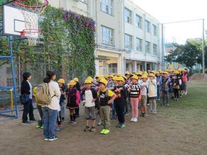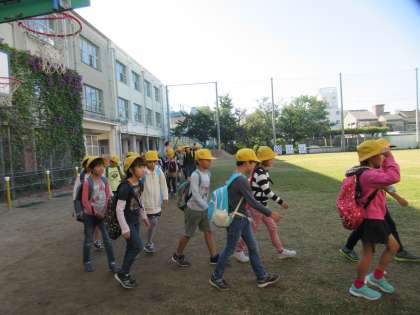 まず学年で集合して、見学の注意を聞いた後、深江橋向けて出発しました。