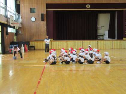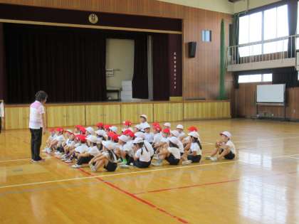 1年生が講堂で体育の学習をしています。今日は説明を聞いてボールを使った運動をする予定です。