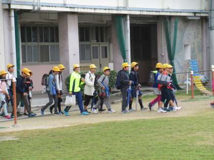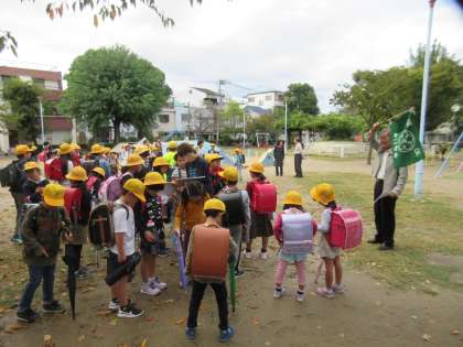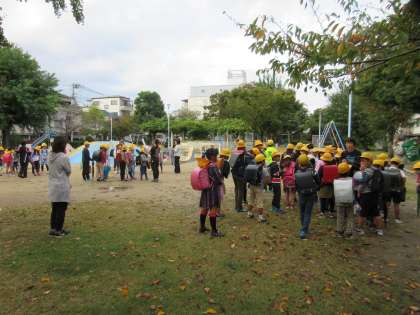 今回の「地域防災訓練」は、まず第一避難場所の各公演に集合し、集団登校をしました。
