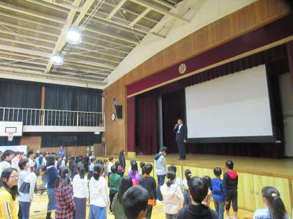 今日の児童集会は、教頭先生と朝のあいさつをして、体育委員会の「オリンピッククイズ」でした。