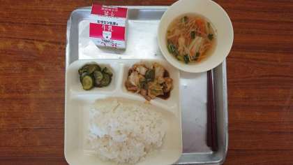 献立:ホイコウロー,中華スープ,きゅうりの辛みづけ,ごはん,牛乳