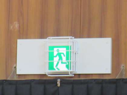 講堂の壁面の誘導灯がとても古くなっていたので、新しいものに取り換えていただきました。体育の時間にボールなどが当たっても割れないようにカバーもつけていただきました。