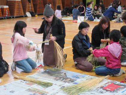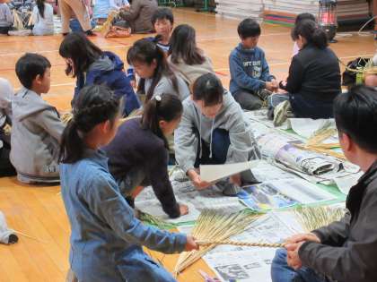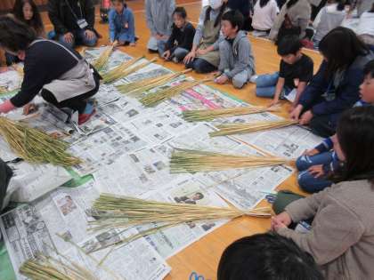 4年生が深江のほこり「菅細工」作りを学年集会で行いました。本日の菅細工はリースを製作しました。深江菅細工保存会の皆様のご指導で、参加した多くの保護者のみなさまと児童が行いました。親子で協力して、菅を巻いてリースの形にしていきます。