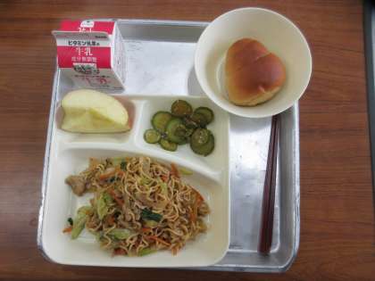献立:オイスターソース焼きそば、きゅうりの中華あえ、りんご、パン(1/2)、牛乳