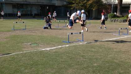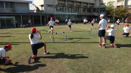 深江小学校では研究教科として、体育学習に取り組んでいます。28日に、6年生の研究授業がありました。単元は「ハードル走」で、児童は自分の課題に一生懸命取り組んでいました。