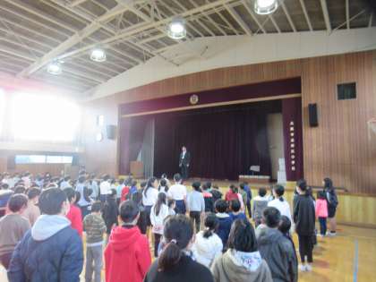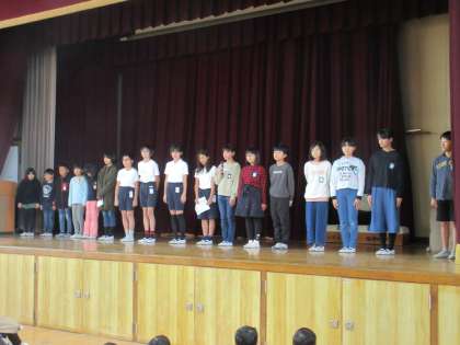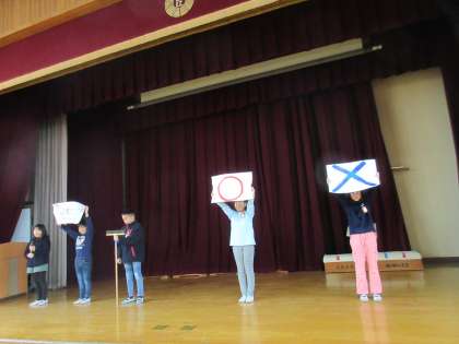 教頭先生のお話を聞いた後は環境委員会の発表でした。今日は清掃用具についてのクイズでした。縦割り班で協力して考えました。